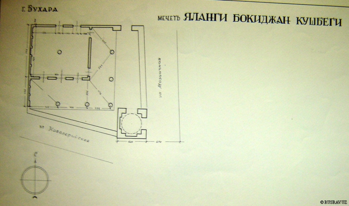 Архивная фотография мечети Яланги Бокиджон-кушбеги, где запечатлена база колонны айвана мечети была сделана в 1950-51 гг., во время экспедиции под руководством Крюкова К.С., Черняева В.В., организованная Управлением по делам архитектуры при СМ УзССР.