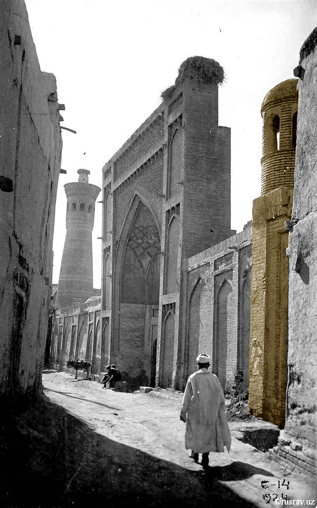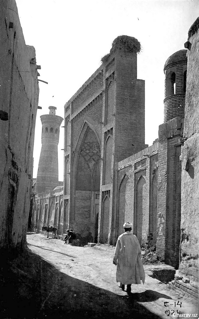 Автора архивной фотографии-открытки, где в кадр попала вход в мечеть и фонарик азанчихона мечети Гузари Хай нам не удалось определить. Фотография была сделана в 1924 году.